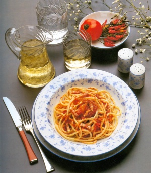 This is the famous boldly flavored, highly-spiced dish from the town of Amatrice, near Rome. It is both simple to prepare and infinitely rewarding in its perfect combination of flavors. >>Authenticity note: The basic, true all'amatriciana (in Rome or Amatrice) uses guanciale -- cured, un-smoked pig's jowls -- rather than pancetta as the meat. Our original recipe, below, uses pancetta because that is the meat we can most easily get in the United States. However, guanciale is now becoming available in this country in a few shops and by mail order, so we are also including the authentic recipe in our web site. Go to all'amatriciana with guanciale for the sauce: