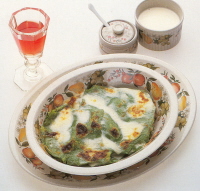 To make lasagne, you will need fresh pasta, ready to be cooked; béchamel sauce; and the mixture or mixtures you are going to use in the lasagne. If you are looking for a default mixture for your lasagne, that's easy. Go right to the bolognese sauce, prepare it, and you are ready with the best. With all of these steps taken, off you go: Steps in making lasagna: Prepare the fresh pasta, white or green. Have it as thin as possible. Cut the fresh pasta strips into about 4 inch by 10 inch rectangles (that is if you are using a 10-inch baking pan or dish. If not, adjust). Prepare the béchamel sauce, and have it ready. Prepare for cooking the pasta: have a pot of 4-5 quarts of salted water boiling furiously; have a bowl of ice water; and have some dry towels, all in the vicinity. Drop in a few of the cut pasta strips. Cook for just an instant, maybe 10 - 15 seconds. Remove with a slotted spoon, or whatever works, and plunge the pasta strips immediately into the ice water. Pick up the strips, and if you want to do the best job possible, rinse the strips immediately under cold water, to rinse off the starch; dry them off as well as you can, by gently squeezing or wiping with a towel; and then put the strips onto another towel to dry. Put a tablespoon of the béchamel sauce on the bottom of the baking dish. Line the bottom of the dish with a layer of the pasta, keeping overlap at a minimum. Add a tablespoon of béchamel and spread it out fairly evenly with a spatula; add a ladle of your mixture and spread it out fairly evenly; add a little parmesan. Repeat: another layer of pasta, covered by the béchamel, spread out; a ladle of the mixture; and some parmesan. And then again. Make at least four or five levels of pasta.; six is fine. When complete, add a slight touch of the mixture to the top layer, a little parmesan, and cook. Cover it loosely with aluminum foil, and bake in a preheated oven of 400 degrees. Bake about 20 minutes. The lasagne should be bubbling hot and the edges should be turning crusty brown. (If you are not getting results at 15 minutes, turn the heat up a little and/or remove the cover). Remove from the oven and set aside to rest for at least 15 minutes. >>options: some like to make the strips of pasta greater than the base of the dish. This allows an inch or two of pasta to overhang. As the last step, then, fold over these overhangs onto the last mixture applied. Others just make pasta squares (as illustrated above) and lay them in the dish to get the best possible coverage, in whatever method or plan works best. And it is possible of course, to use purchased dried lasagne pasta: one just misses the great taste treat that fresh gives you. (or even pre-cooked lasagne strips if you must).