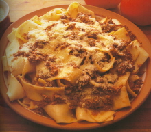Pappardelle ("gulp down pasta") have always been considered a special treat for many pasta lovers. They are a fresh egg cut in wide ribbons -- one-half to one inch wide, and about six inches long. One finds pappardelle mostly in Tuscany and in Piedmont. They meld beautifully with game and heavier meat ragus. Wild boar, hare and rabbit are most frequently the sauce of choice in Tuscany. Lamb and meat ragus are found often in the north. Wonderful fall or winter comfort treat -- hearty one-dish meals. They are worthy of a special section in the egg pasta category. |