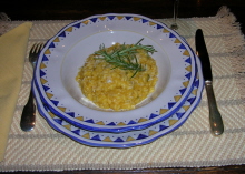 Put the squash into a steamer basket over a pot of boiling water, cover, and steam about ten to fifteen minutes, until the squash is tender. (We actually use a wok and bamboo steamer, Chinese style, for this process). Remove from steamer and put on cutting board. When the squash has started to cool, scrape the flesh away from the skin, into a bowl. Discard the skins. Smash the squash somewhat so it is a rough pulp. to cook the risotto: (a more detailed and elaborate description of the risotto cooking technique can be found at how to cook risotto). Bring the stock to a slow simmer in a pan next to the risotto pan. In a thick-bottomed pan (the risotto pan), over medium-high heat: add the olive oil and one tablespoon of butter. Add the onion. Cook until soft (about four minutes over a medium-low heat). Add the rice and stir until each grain is coated with the oil. Add the white wine and stir briefly. Now add a cup of stock and the squash. Stir; add a teaspoon of salt. As soon as the stock liquid is absorbed, add another cup of stock. Continue to add the hot stock, ladle by ladle, only adding another ladle when the previous ladle of liquid has been absorbed, stirring and tending almost all of the time. Continue adding the ladles of stock until the rice is properly done: twenty minutes or so. Just before it is perfect al dente, add the rosemary and nutmeg, and a twist or two of the pepper mill and stir well. Determine proper doneness by tasting regularly. When it is just al dente, with a little creaminess, it is ready. Take off the heat. Stir in the parmesan, and the final tablespoon of butter. Taste for salt. We let it sit, covered, for a minute or two. Serve into preheated bowls (hopefully a color that will meld perfectly with the beautiful squash color). Add a sprig of rosemary to each bowl, and sprinkle with a little more parmesan. |