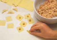 Fold the square in half to make a triangle, almost! The folded over piece should cover the filling of course, but not run up all the way to the edge of the bottom -- showing a little border. Press down on the edges to seal the filling in. Now the fun part, the tortellini finger-dexterity dance. The idea is to pick up the triangle and place it, centered and with the long side at the bottom and the point at the top, around your index finger (which is pointing toward you). Then with your thumb and your other hand, or whatever works, bring the edges together, slightly overlapped, and squeeze these corners, sealing them. Practice will provide you with the finger movements that work for you, remembering it is all worth it!