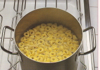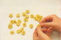 Before taking the finished product off your index finger, gently fold back the very peak of the triangle, also squeezing it to make sure the stuffing is completely enclosed. The folded over little top gives the cappelletti the hat shape that gives it is name. for tortellini (if you want to be pure about the nomenclature): Cut circles in your flat fresh pasta sheet with a round cookie cutter or similar. About 2 inches in diameter. Put 1/2 teaspoon filling in the middle. Moisten the edges. Fold the circle in half, creating a half-moon, but as above, not folded over quite all the way. Leave that border. Now do your finger-dexterity thing, wrapping the half moon around your index finger. Bring the bottom edges together, slightly overlapped, and squeeze them together to make a seal. Make sure it is thoroughly sealed all the way around. There is no "top" with this approach, so no hat. Place the individual tortellini on a dry towel, making sure they do not touch! Turn them after a time to let them dry on both sides. They will be very hard when properly dry. These gems can be used right away, or refrigerated for use later.