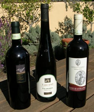 world class wine from the foot of Mount Vesuvius . We have "taken it back" during the course of classicpasta.com's life, regarding Italian whites. Now we want to move forward! -- and recognize three brilliant and wonderful whites from Campania, grown in the shadow of Mt. Vesuvius. The three, pictured above in appropriately a sunlit setting, are Greco di Tufo, Fiano and Falanghina. They have been called the noble whites of Italy. For those of us who think the celebrated whites of the north are still over-rated, and mostly over-priced, here, in these three, one can find not only value but superb taste. Greco di Tufo, our first great discovery from this region, comes from the Greco bianco grape. And Fiano di Avellino, comes from the Fiano grape (of course). Both of these grape varieties came to Italy from Greece in about the seventh century B.C. Falanghina is an aromatic variety of grape that comes from the small villages near the volcano. Campania's place in the wine spectrum started in the 80's, and blossomed, literally, in the nineties. And they have continued to take market from the average pinot grigio as "the Italian wine of the table." The small producers have followed the lead of the big names, like Mastrobernardino, started taking greater care in growing and then they started bottling, and exporting, the wines themselves. Terredore di Paola and Feudi San Gregorio are the other big guys in wines of the area. Greco di Tufa is a solid, balanced white with great acidity and also a basic earthiness. It does get better after two years or so in the bottle, but young is fine also. Fiano is more mineral, and fuller, softer and riper than Greco, and has been identified with a subtle, waxy texture, according to wine writer Miochael Apstein, of the Chronicle, who is responsible for bringing these wines to the attention of wine lovers in this country. Falanghina is the newest of the three, but has a rapidly growing following. It is lively and refreshing, a touch floral, but carries a high acidity. It is a great white for many foods. Reds . . . Worth mentioning also, is the rightfully growing popularity of the reds of Campania: the Taurasi, a DOCG wine, and other wonderful wines from the Aglianico grape.